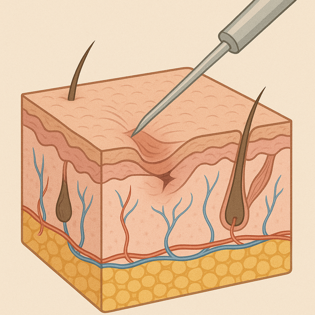 꺼진 흉터의 밑부분 자리잡고 있는 섬유끈을 물리적으로 끊어내어 살이 잘 차오르도록 하는 시술입니다.